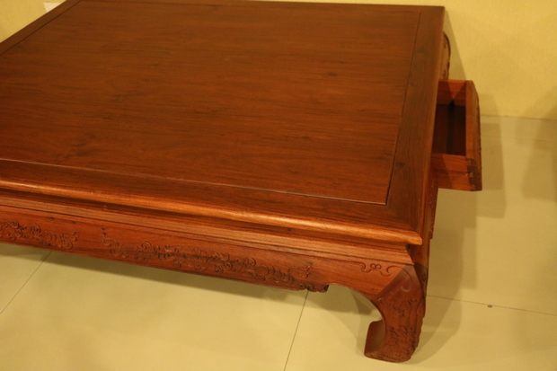 沙發的其他各處細節。其座椅面,平整略帶淡雅的原木光澤,顯得十分地古典清秀,清新而自然。沙發的四處椅角設計則比較有特色,非一般沙發筆直或稍顯圓潤的直線型豎直設計,其風格有些像動物的犄角,彎曲而延伸,安然優雅而簇立,顯得地十分溫婉可掬,驚艷動人,就如同那華貴的牡丹,艷壓在那群芳之中,清新而脫俗。而椅座面下方與椅腳相連的幾段木橫處,同樣飾繪有牡丹的圖案紋飾,并且在其左右兩端各串有幾銜銅錢,隱含著“滾滾財源”“富貴吉祥”的寓意。