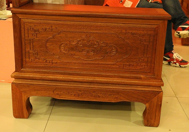 其二是雕繪在二人座長沙發背靠板后方的那驚艷之“梅蘭菊”組合紋飾,其雕繪手法表現空透剔凈、浮雕技藝精湛細膩、生動浮縷。其最左端,是為傲然于雪之寒梅,靜立在那花瓶之中,凌厲花瓣,寒香飄蕩;還有那左處有絲葉交伴,香雅怡情的清雅閑蘭在近景處不遠觀看,孤芳自賞;而最右端一側,則是為那凌霜飄立、特立獨行之雛菊閑庭綺麗于上,那晚秋的冷香,濃郁而撲鼻。三處花案圖樣各自代表著一種高潔的君子情懷:梅的堅忍、蘭的空古、菊的脫俗。看它們挺立在不遠的身旁,總歸是一番別樣之感,你是否也會有同樣的感受呢?