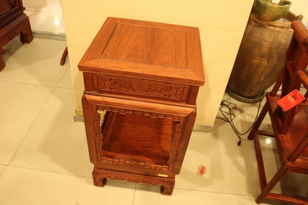 再往下,在沙發的扶手處,上方里外兩側各修幅幾邊縱橫框架紋飾,紋飾內鑲有兩目龍首,面面相對而屹,象征著吉祥與福運。